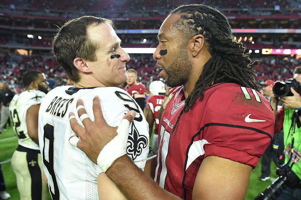 Drew Brees and Larry Fitzgerald will enter the Hall of Fame together this summer. (Photo by Norm Hall/Getty Images)